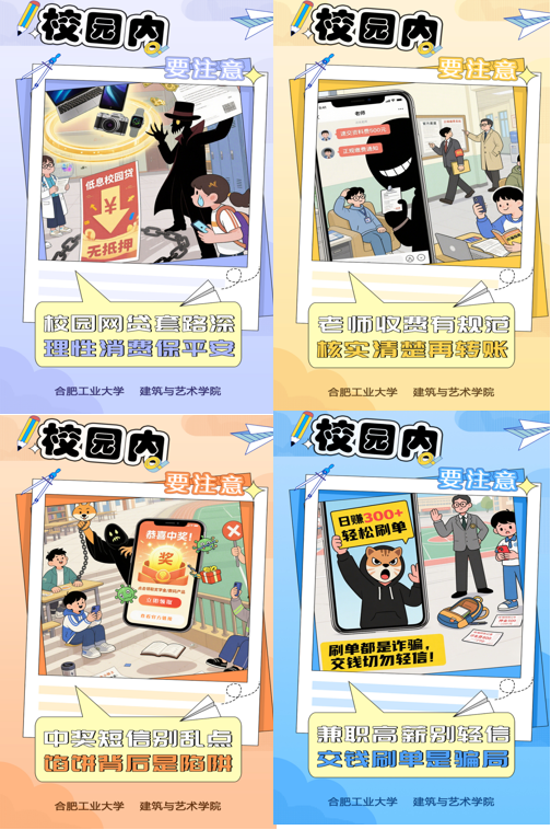11月15日,立足学院专业优势,学院同步启动“艺起防诈”主题创意作品征集活动。学生结合视觉传达、环境设计等专业所长,自主设计反诈主题海报等网络作品,通过学生喜闻乐见的形式提升防诈意识,实现“以艺载道、以美育人、以智护安”。