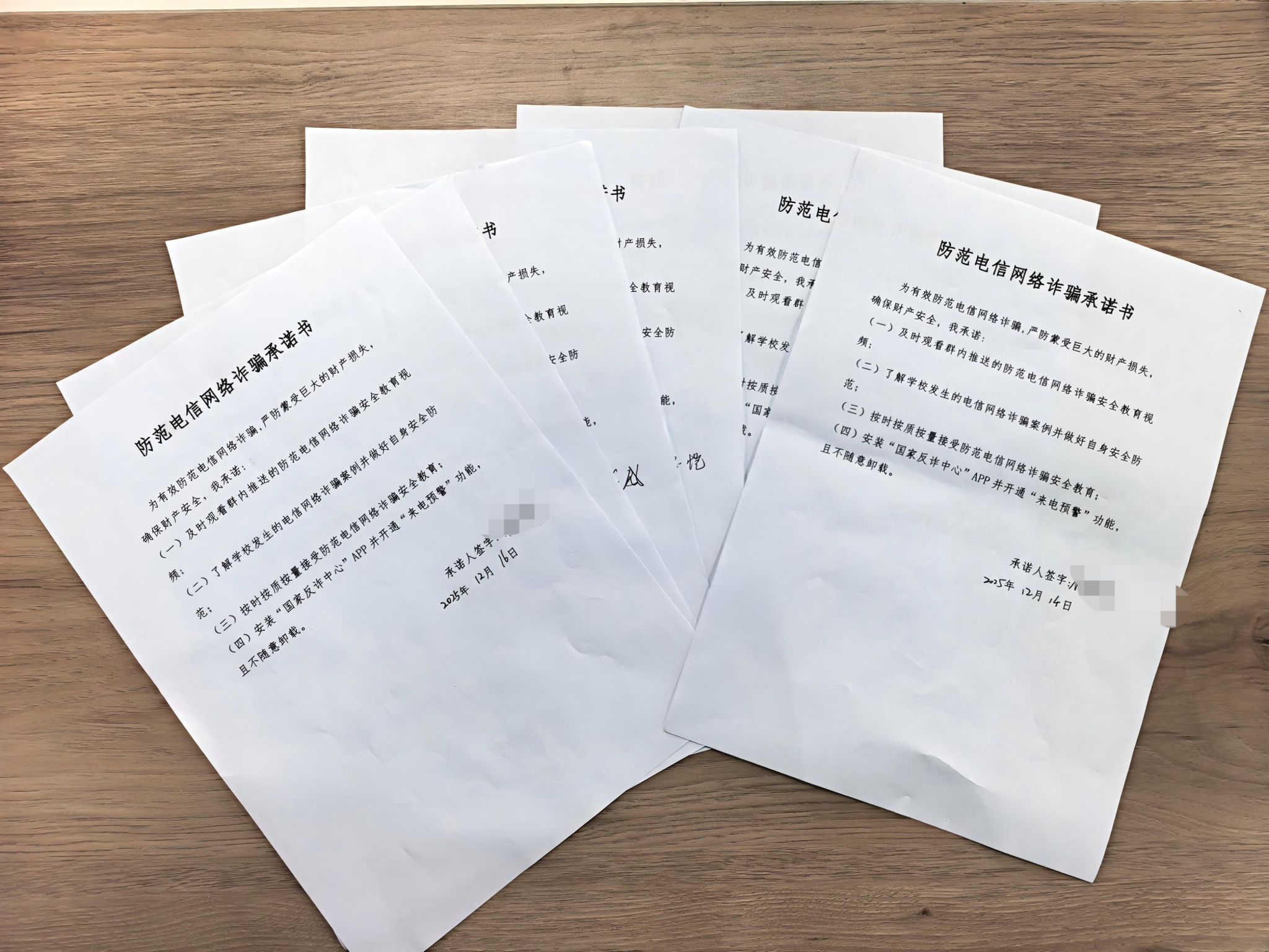 为强化责任意识,实现反诈教育全覆盖,学院组织全体在校本科生、研究生签订《防范电信网络诈骗承诺书》。承诺书内容涵盖“自觉学习反诈知识”“严守个人信息安全”“主动劝阻身边可疑行为”等具体条款,引导学生从“被动防”转向“主动守”,以书面承诺促进行为自觉,切实将反诈责任压实到每一位同学。