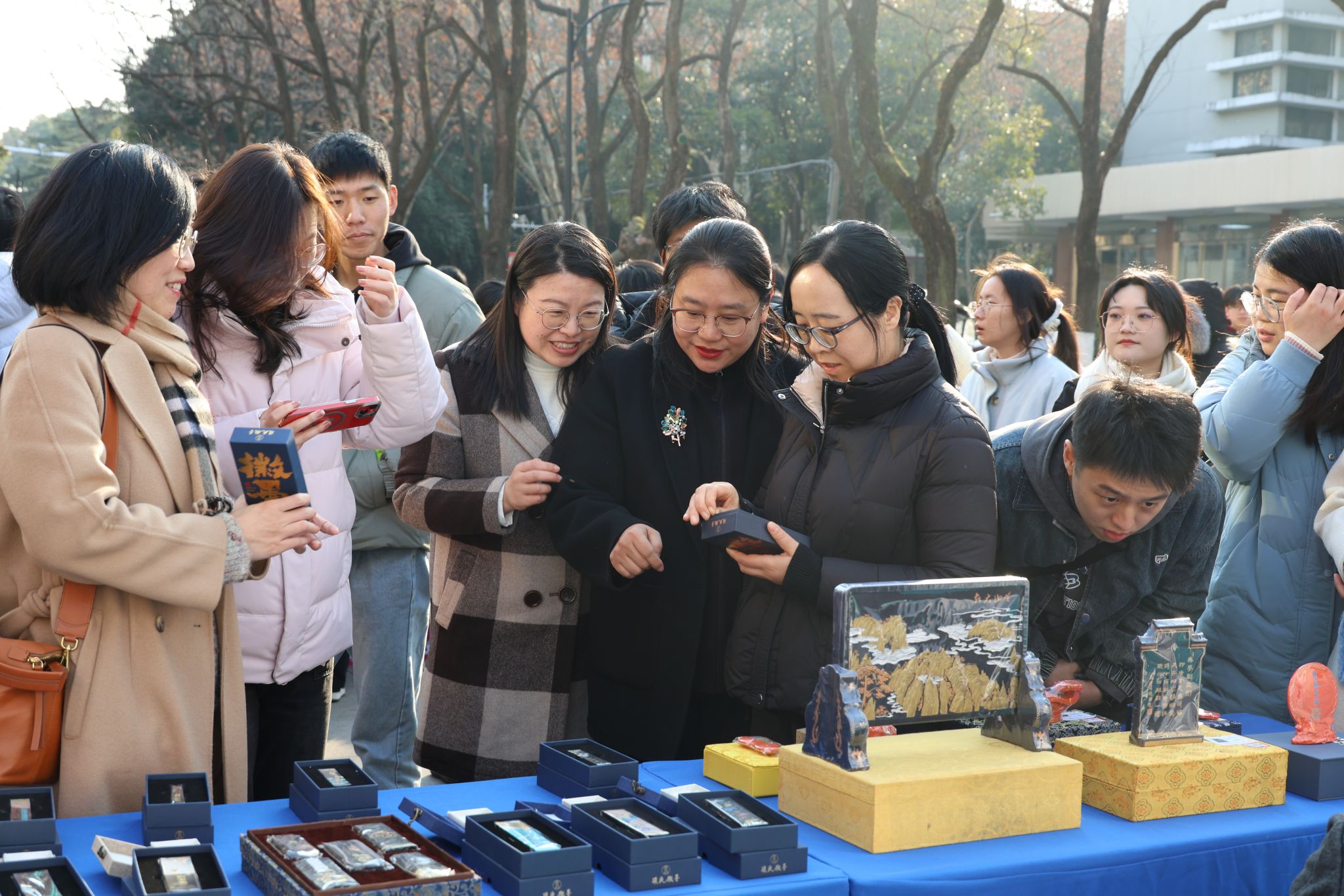 仪式结束后,与会师生前往展览区参加“徽韵传薪·魅力非遗”导学思政实践活动。在5位非遗传承人的现场指导下,师生近距离体验徽墨制作、徽州砖雕、徽州剪纸、徽州木雕、歙砚雕刻等技艺,沉浸式感受非遗技艺的独特魅力,在亲身体验中坚定文化自信,在动手实践中提升文化素养。此外,现场还举办了建艺学子的设计作品展,展示了学生结合二十四节气、地方特色等设计的文创、包装、周边等,共同打造了一场“可观、可学、可悟、可玩”的非遗文化盛宴。