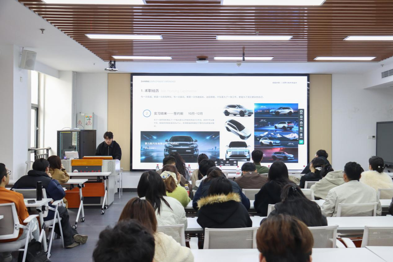 成恩宏聚焦建筑学领域,结合参与工作室横向课题、专利研发及专业竞赛的经历,建议同学们提前规划职业意向,并细致讲解简历制作与面试的实用技巧;吕伟宁以字节跳动、百度、美团等互联网公司实习履历为切入点,从产品增长设计、AI产品体验等角度,分享如何通过多段深度实习打磨核心竞争力;李希瑞结合专业类竞赛获奖经历,介绍了如何明确未来工作意向,并为有跨行业求职想法的同学提供针对性建议;韩炜围绕工业设计工程方向,分享AIGC辅助设计等前沿技术在作品集制作中的应用技巧,详细介绍了简历投递、面试考核等求职要点。