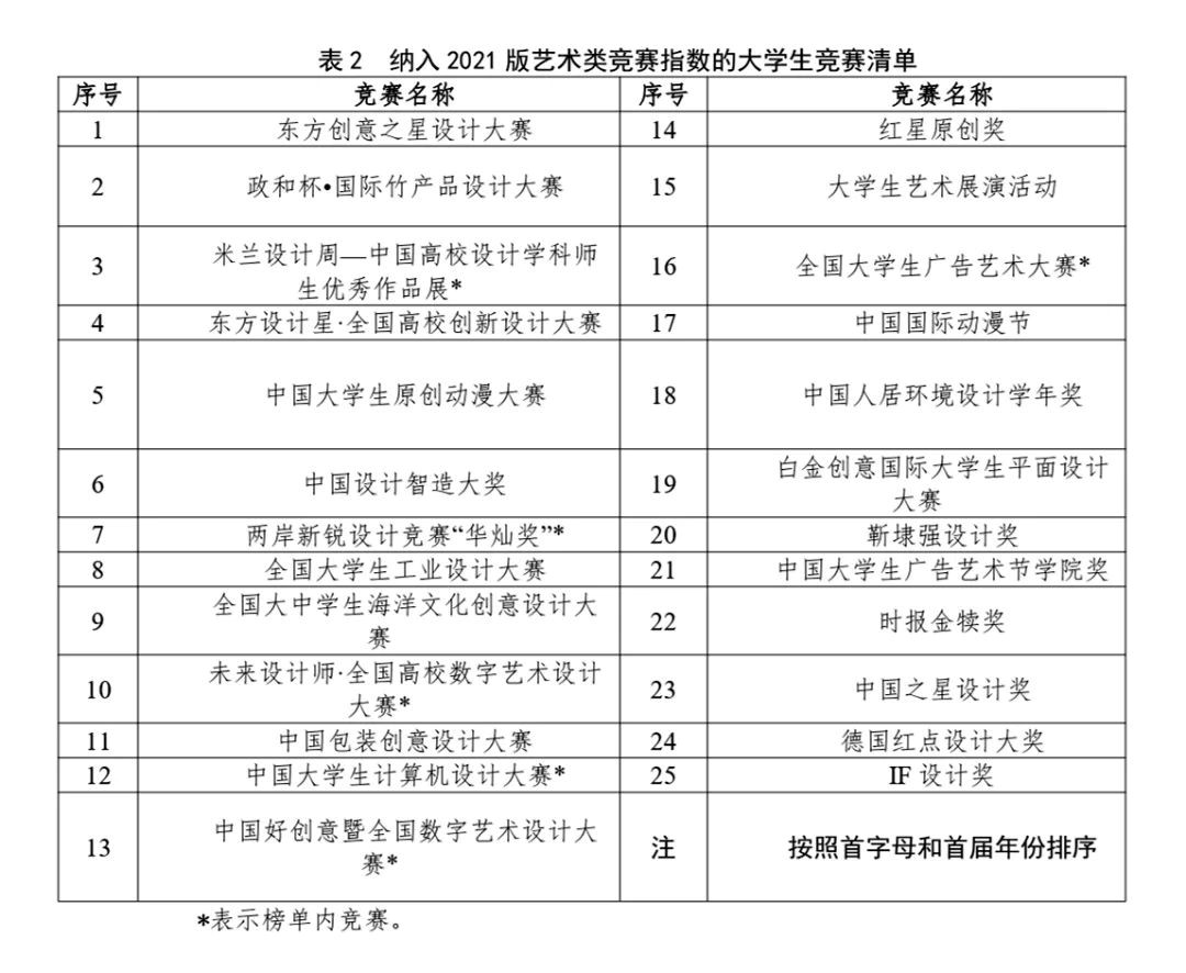 中国高等教育学会“高校竞赛评估与管理体系研究”专家工作组以开设艺术学理论类、音乐与舞蹈学类、戏剧与影视学类、美术学类、设计学类等艺术类相关专业的普通高校为主要对象,采集了25项高校艺术类相关竞赛近三年共1155683条竞赛数据,从获奖贡献、参赛贡献两个维度构建了评估模型,研发了艺术类竞赛指数,并划分为A+、A、A-、B+、B、B-、C+、C、C-九个等级。